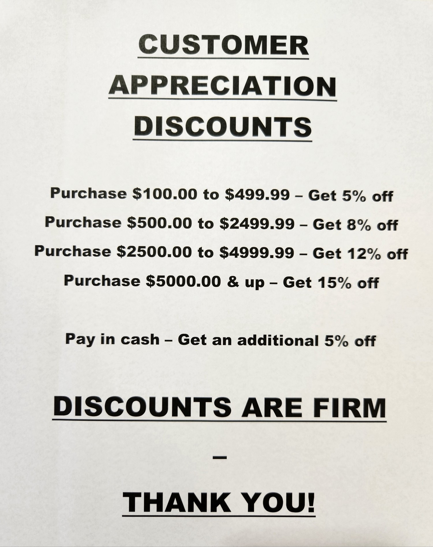 CASH DISCOUNT AVAILABLE